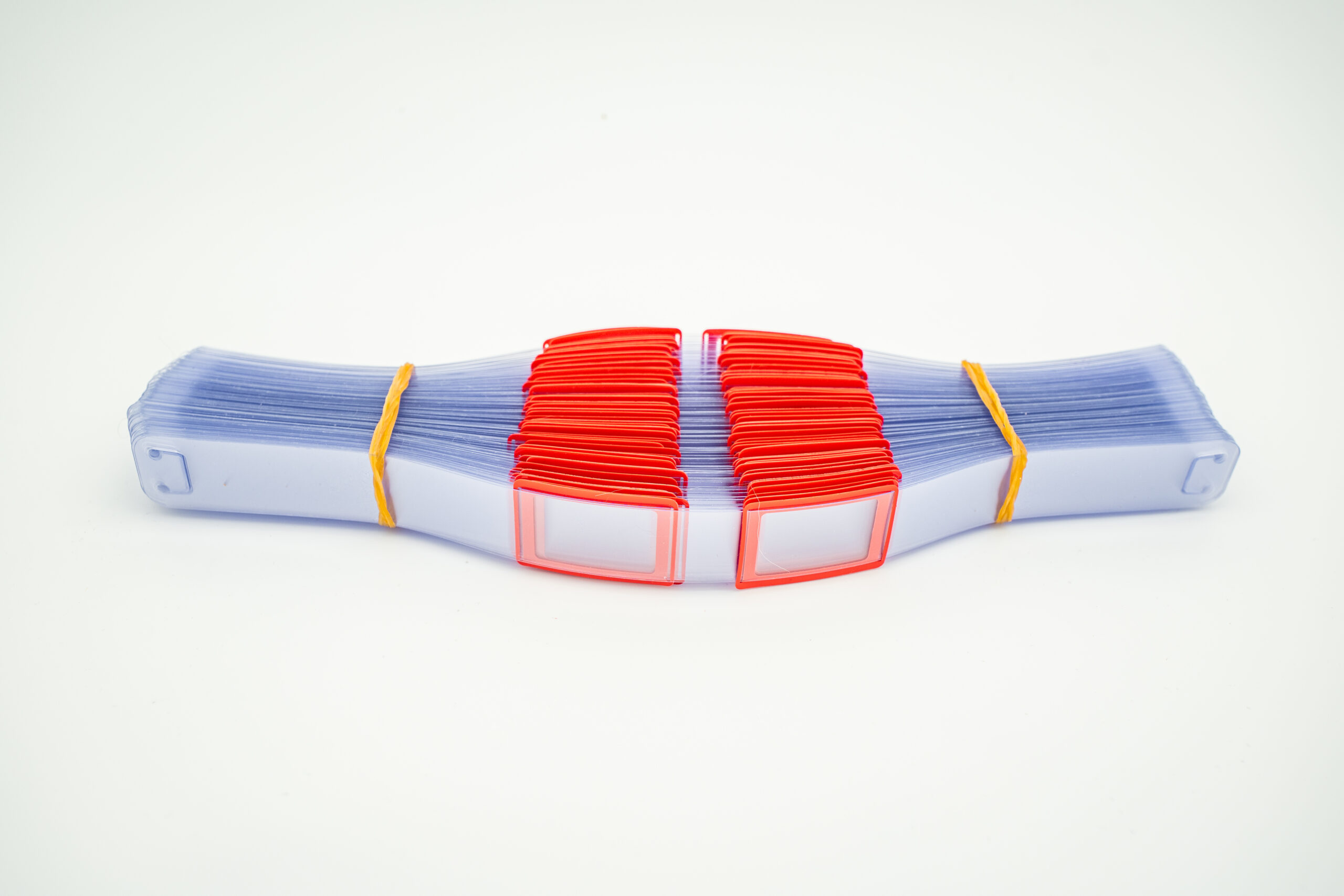 - Bezgumkowe z folii o grubości 0,40 mm. Pasek wraz z ramką okienka mocowany jest na kalendarium za pomocą specjalnych nacięć w pasku. Pasek wykonywany jest z wysoko przeźroczystej folii PVC o grubości 0,40 mm i długości precyzyjnie dobranej do szerokości plecków kalendarium, co zapewnia stabilne trzymanie się paska.